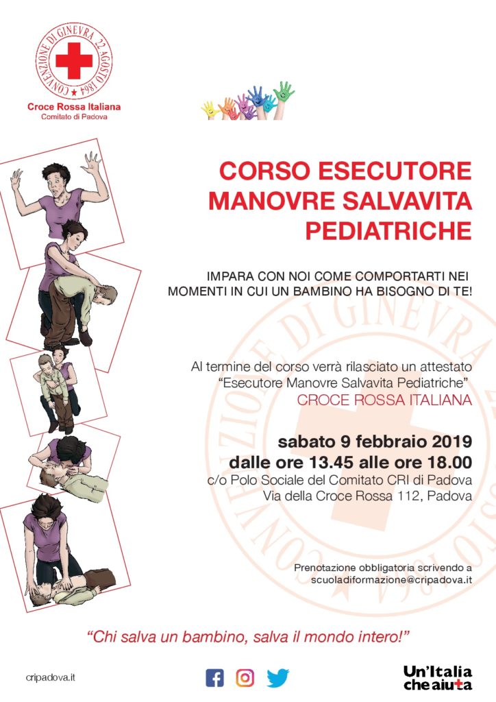 La Croce Rossa Italiana – Comitato di Padova – organizza un corso formativo teorico/pratico sulle Manovre Salvavita Pediatriche rivolto a genitori, insegnanti, babysitter e tutti coloro che si prendono cura dei bambini. Il corso prevede una quota individuale di 35,00 Euro. Prenotazione obbligatoria scrivendo a scuoladiformazione@cripadova.it